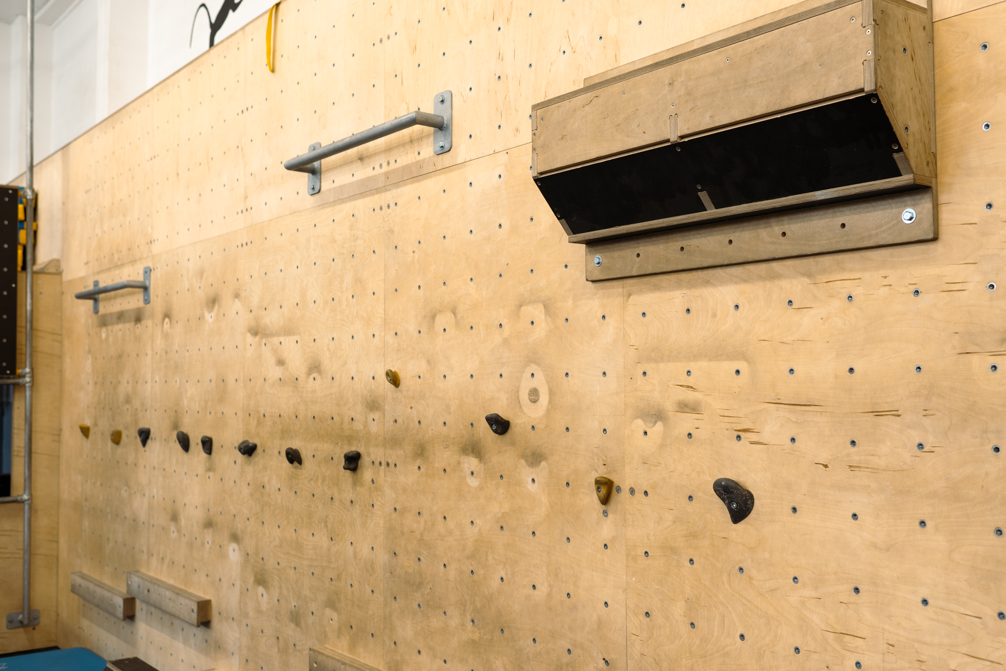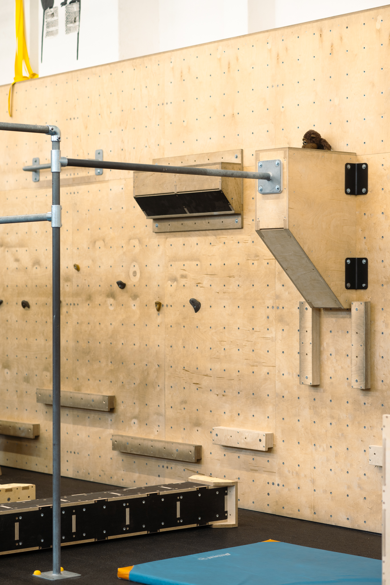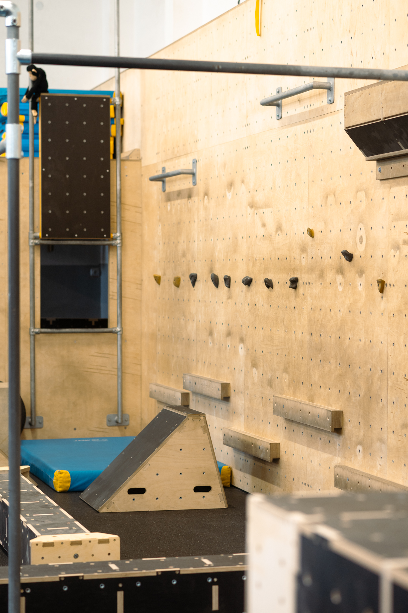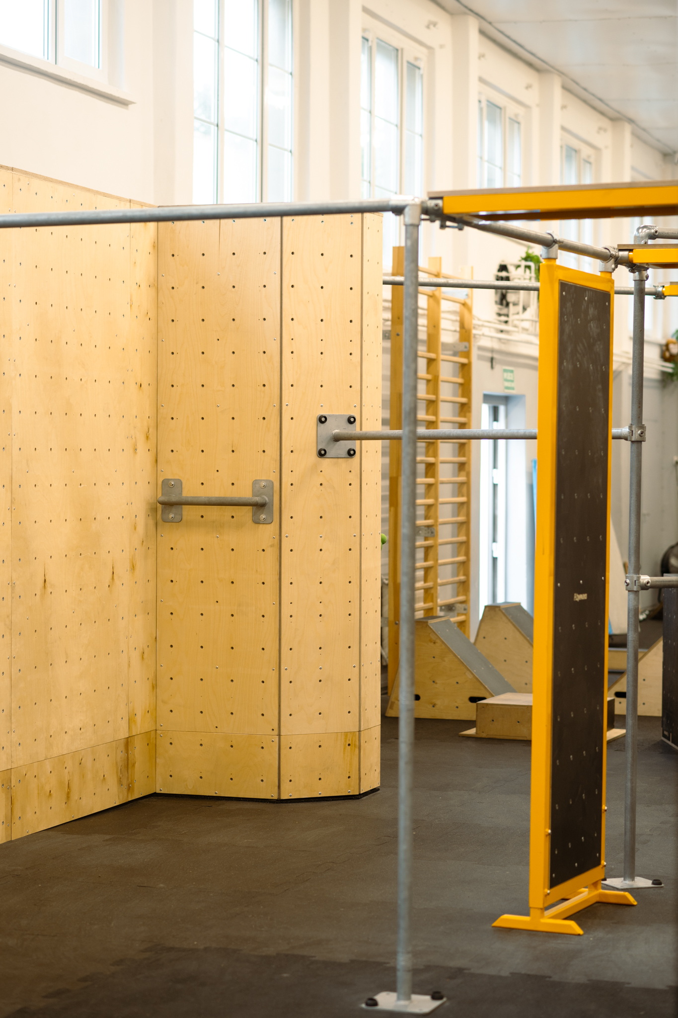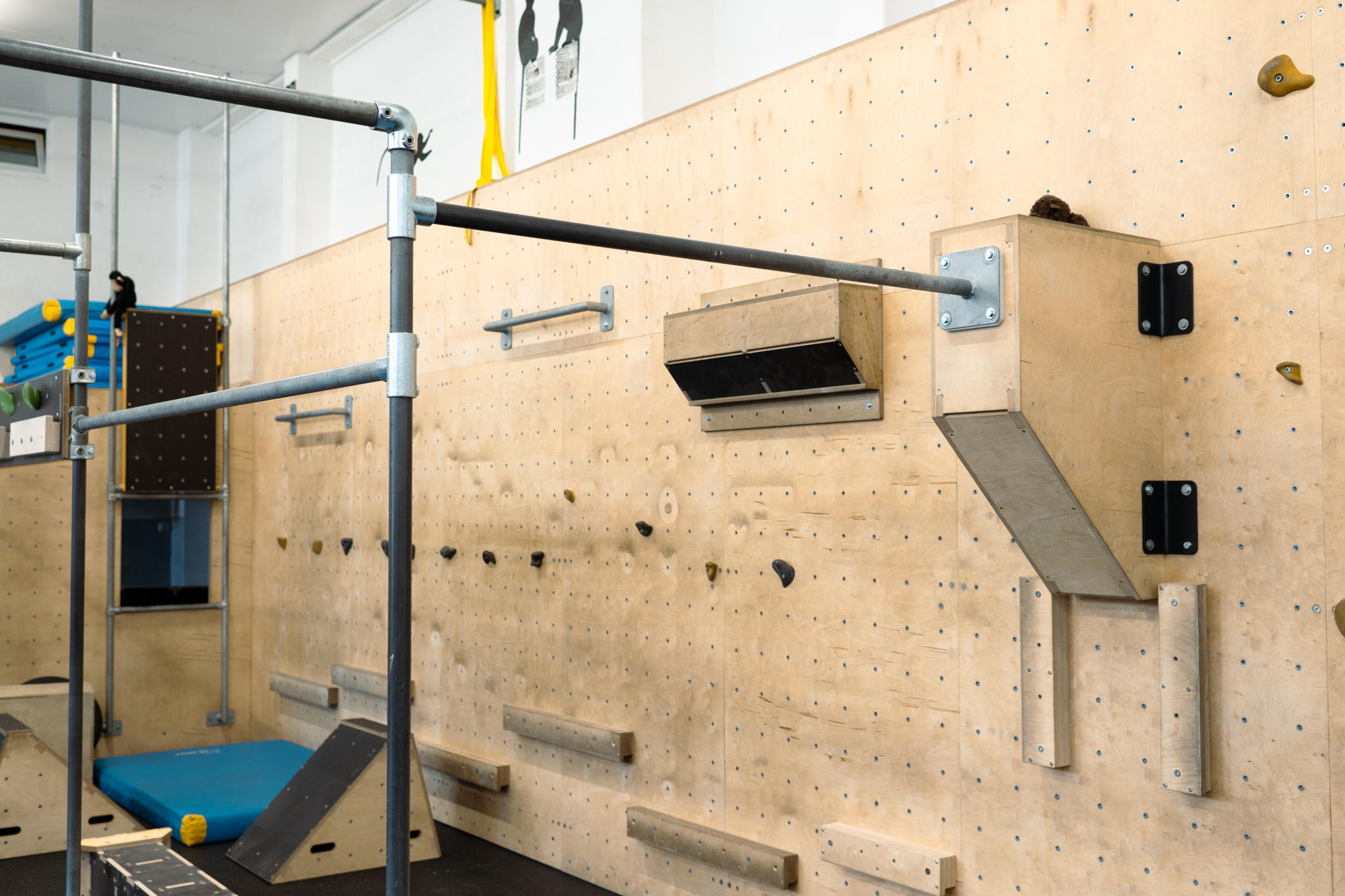 Modularna ściana pozwala na przykręcanie chwytów wspinaczkowych, drążków i wszelkiego rodzaju innych sprzętów, dzięki czemu możemy tworzyć nowe kombinacje skoków, czy przejść. Jesteśmy jednym z niewielu miejsc w całej Polsce, posiadającym te instalacje!