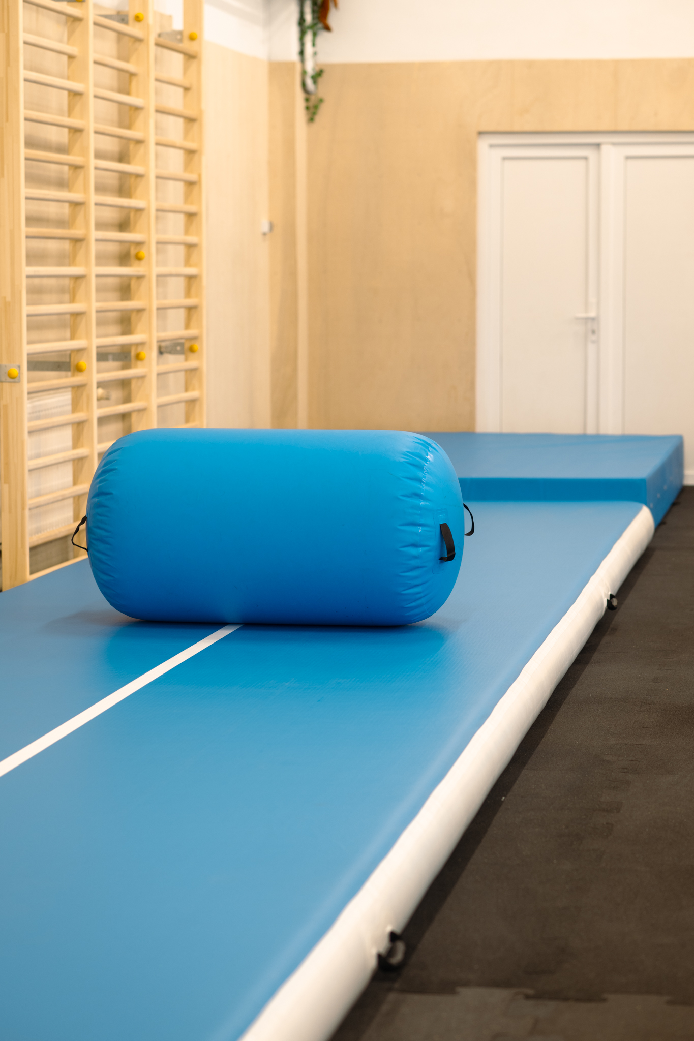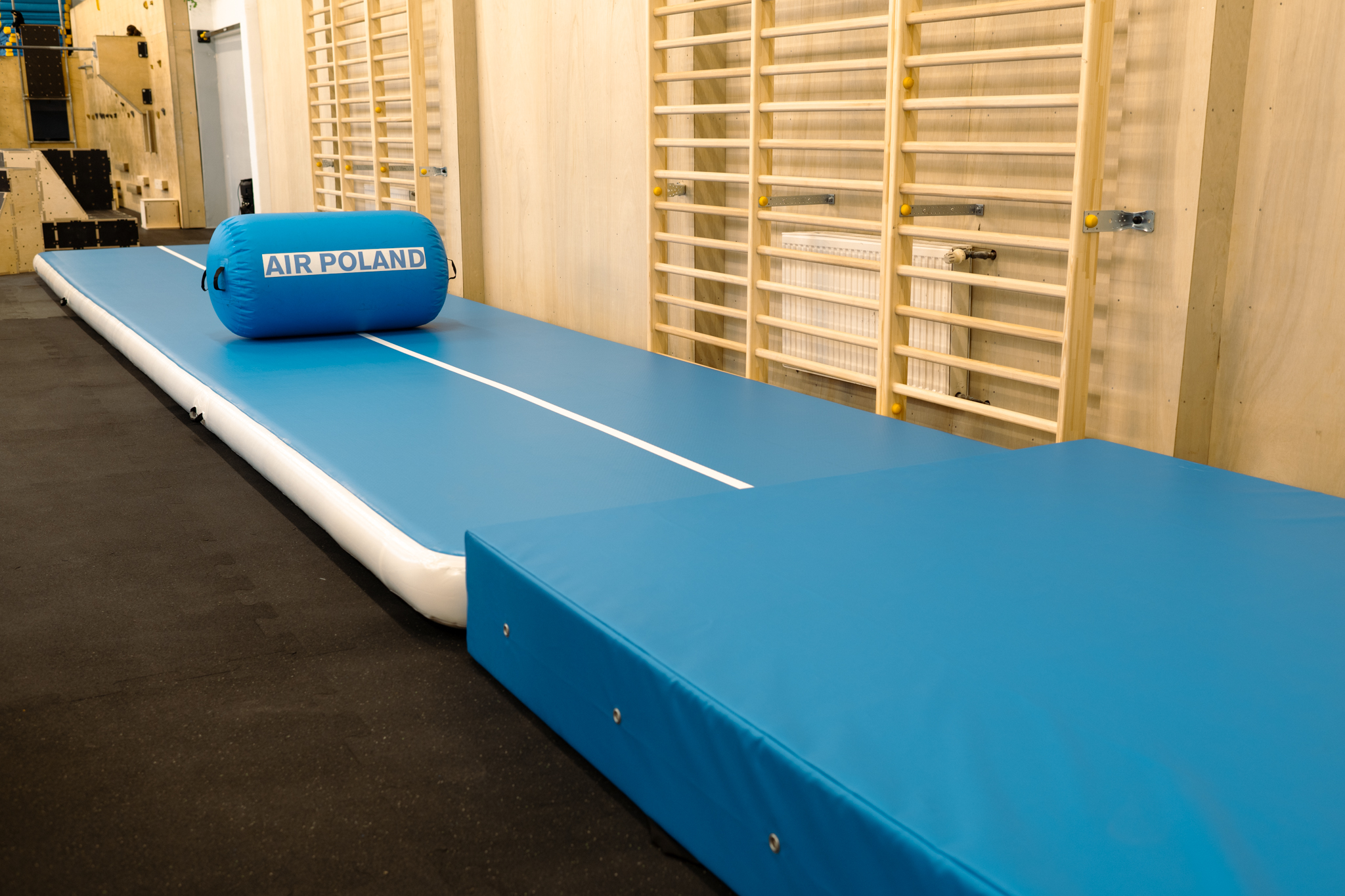Na sali również posiadamy air track, jest to lekki i przenośny matowy tor gimnastyczny, idealny do treningów akrobatycznych, gimnastyki, parkour i innych dyscyplin sportowych.